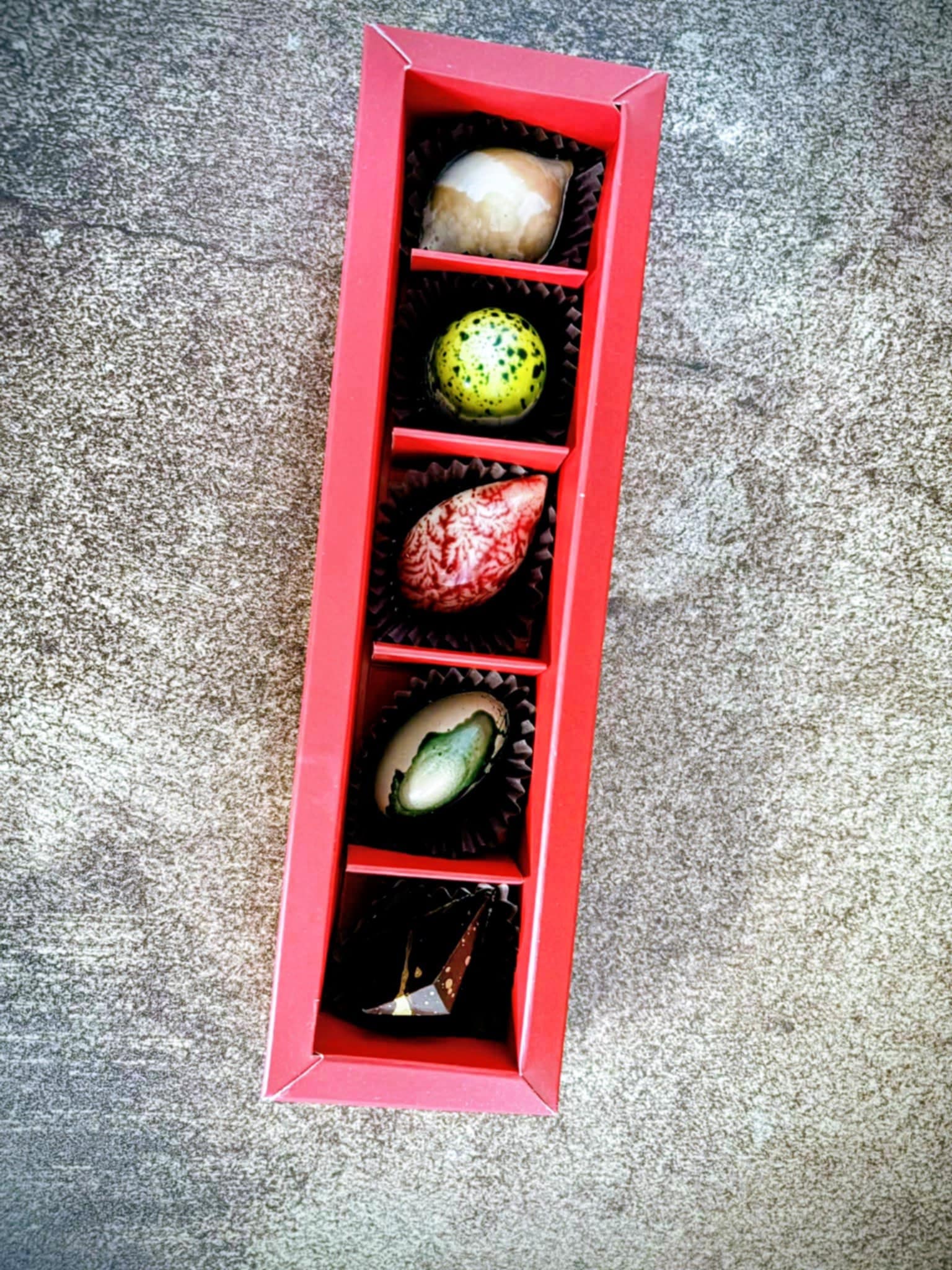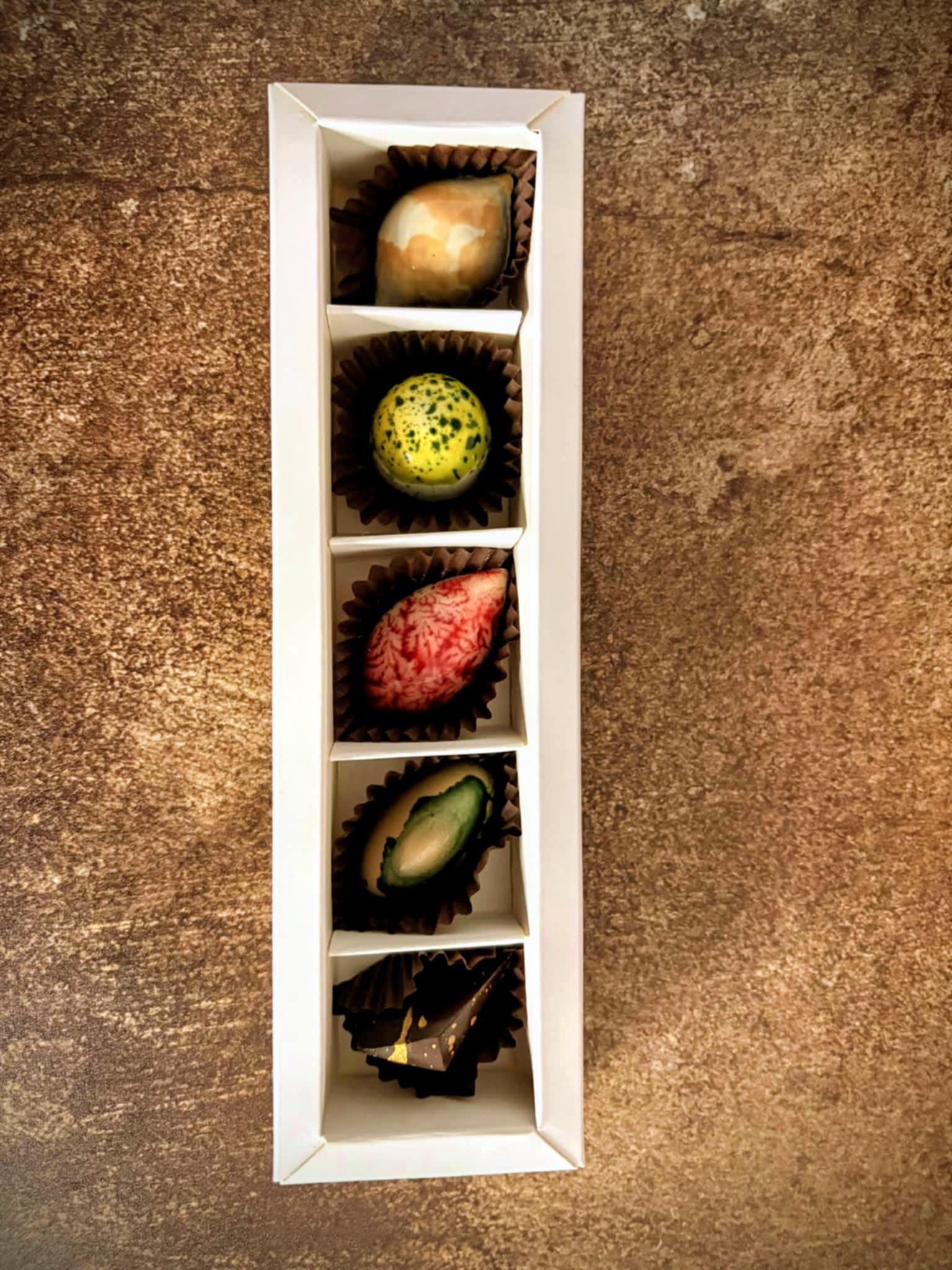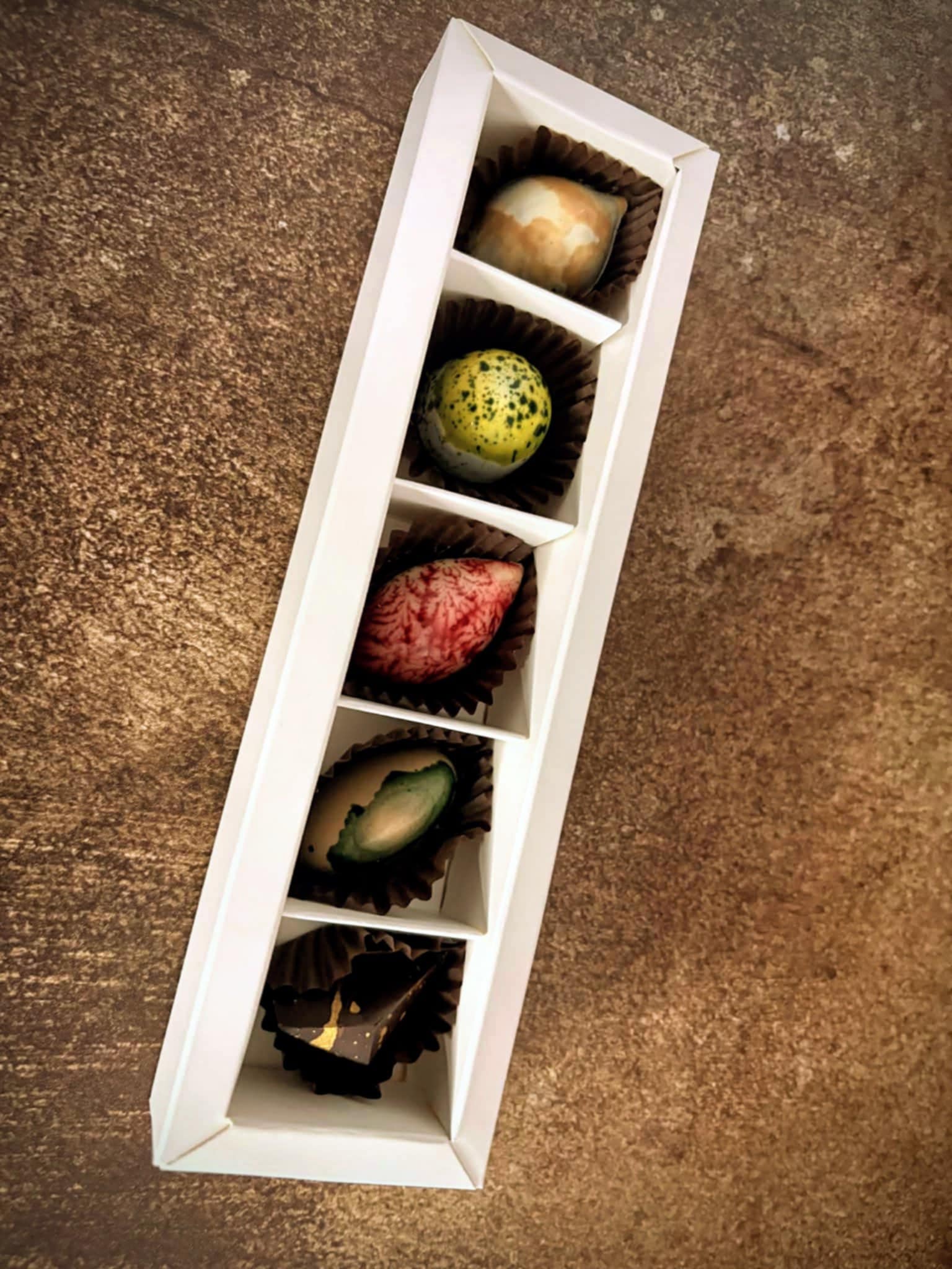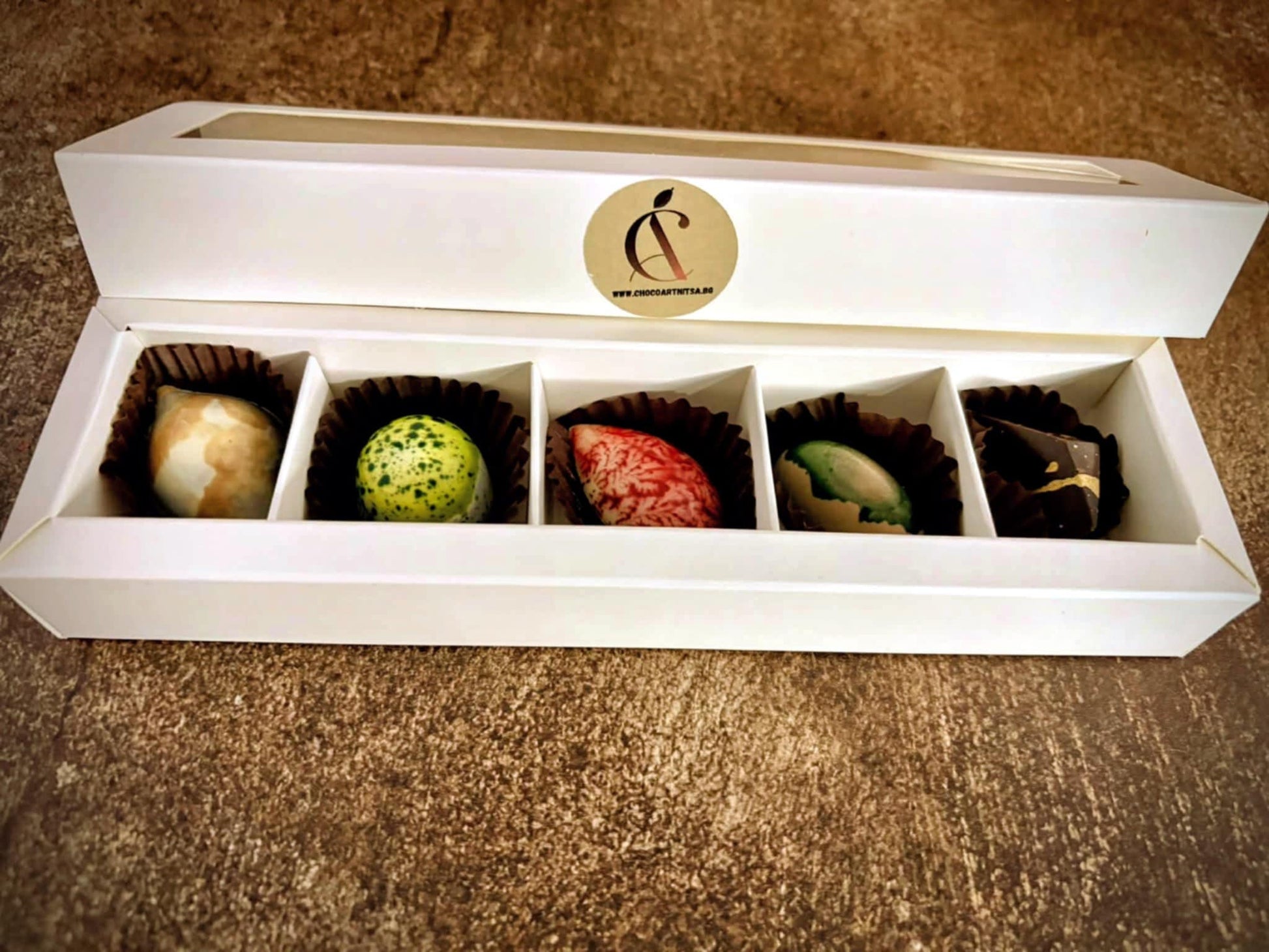 Всички бонбони са с тънка черупка от фин белгийски натурален, млечен или бял шоколад. На всеки един се отделя специално време и внимание, за да се превърне в бижуто, което виждате. Вкусовете, които виждате са: