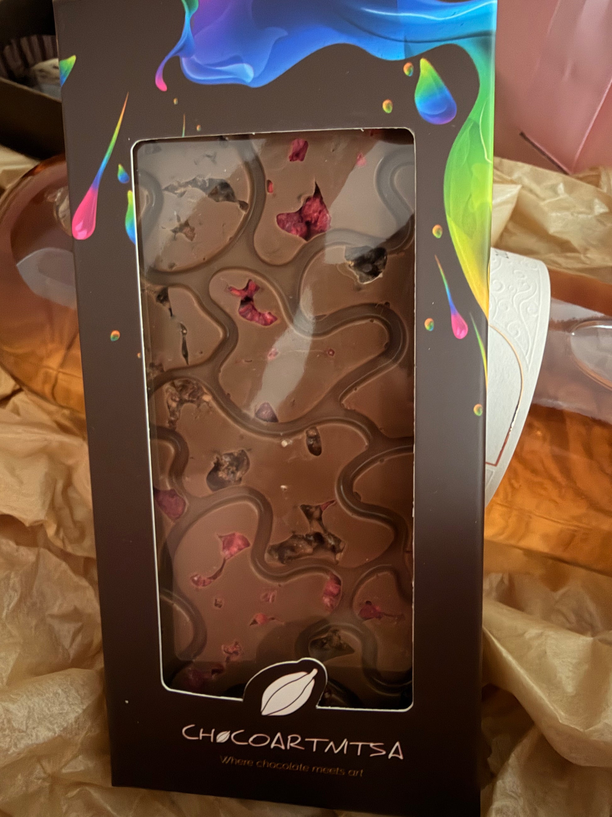 - Млечен шоколад с карамелизирани какаови зърна и лиофилизирани малини – перфектен баланс между сладост и леко кисел акцент