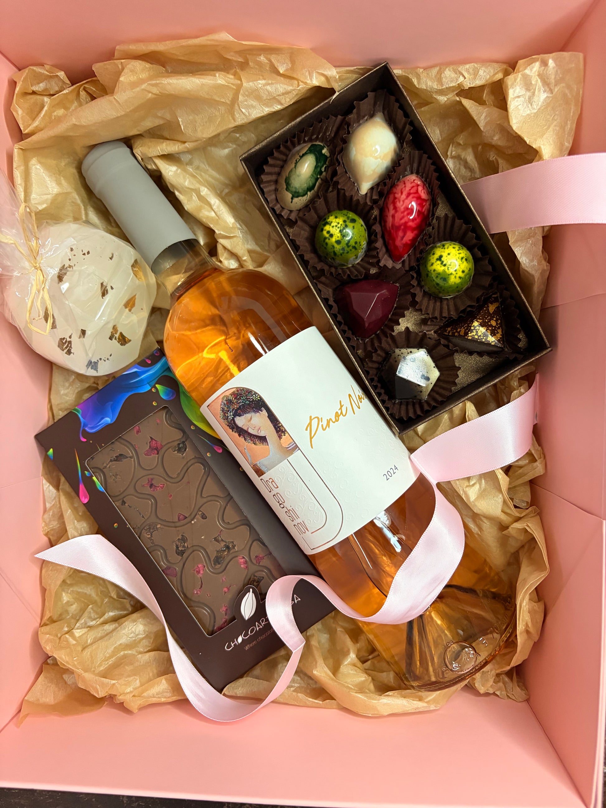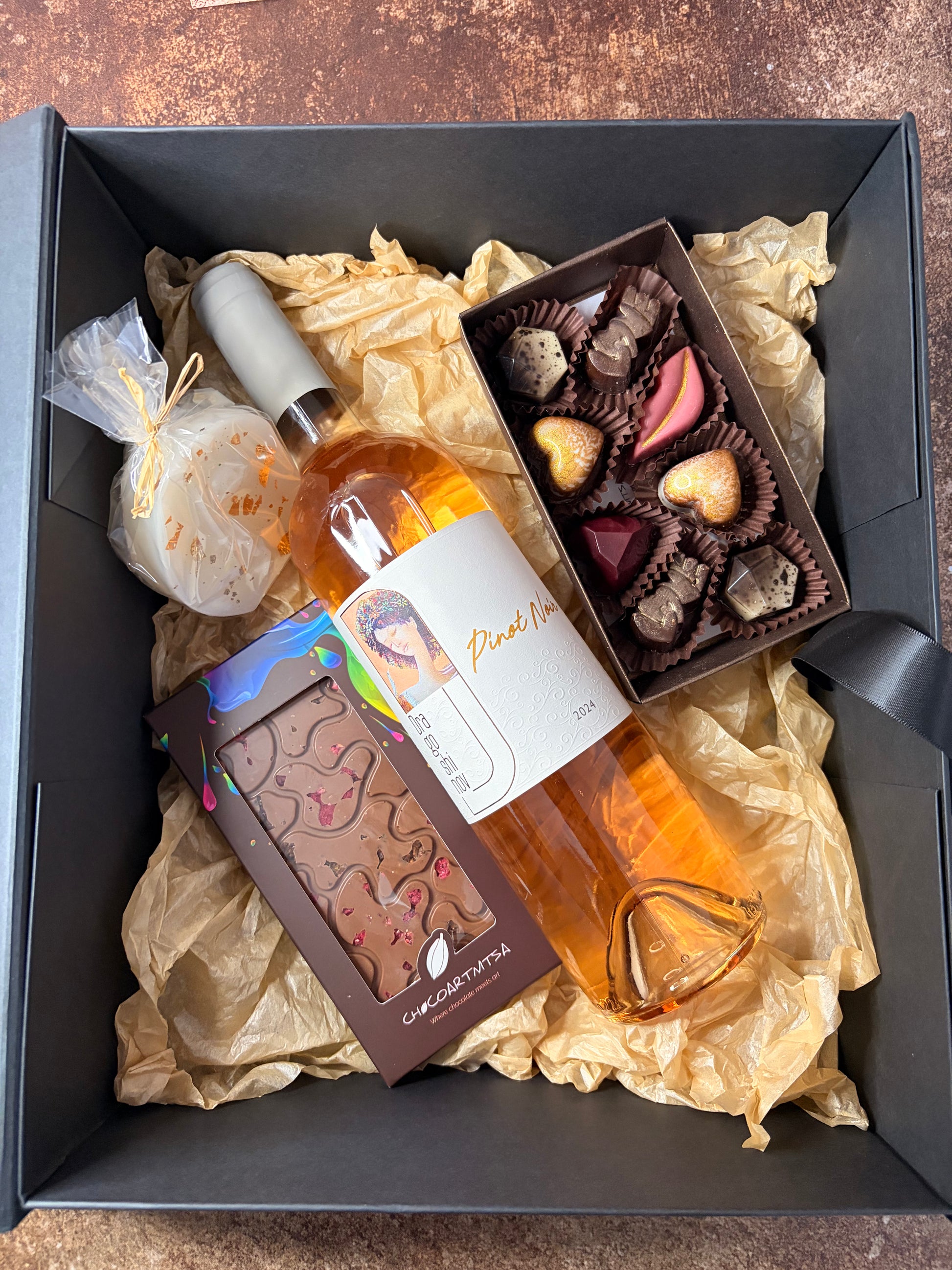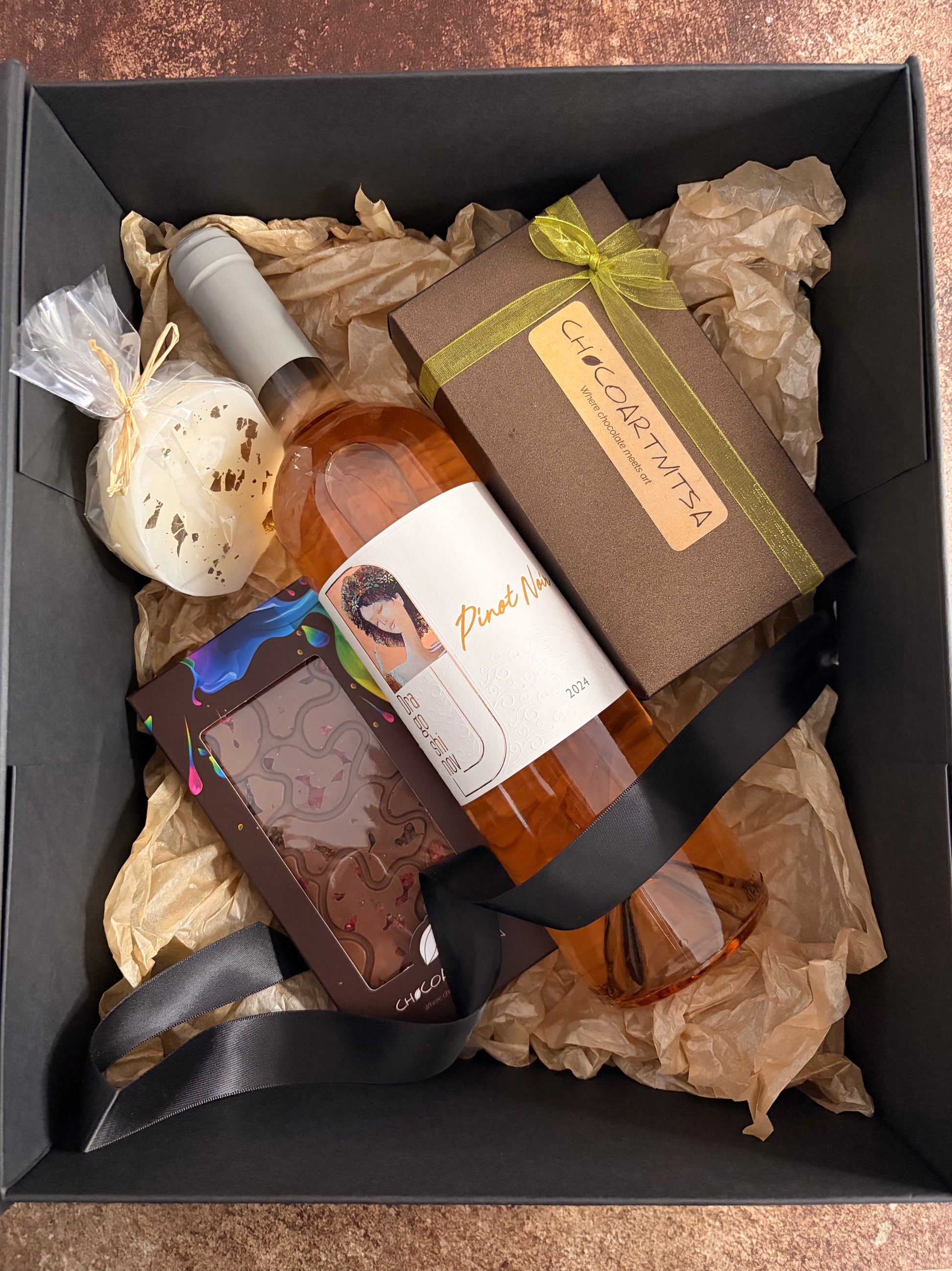 Луксозна подаръчна кутия с Розе, ръчно изработен шоколад, бонбони и свещ