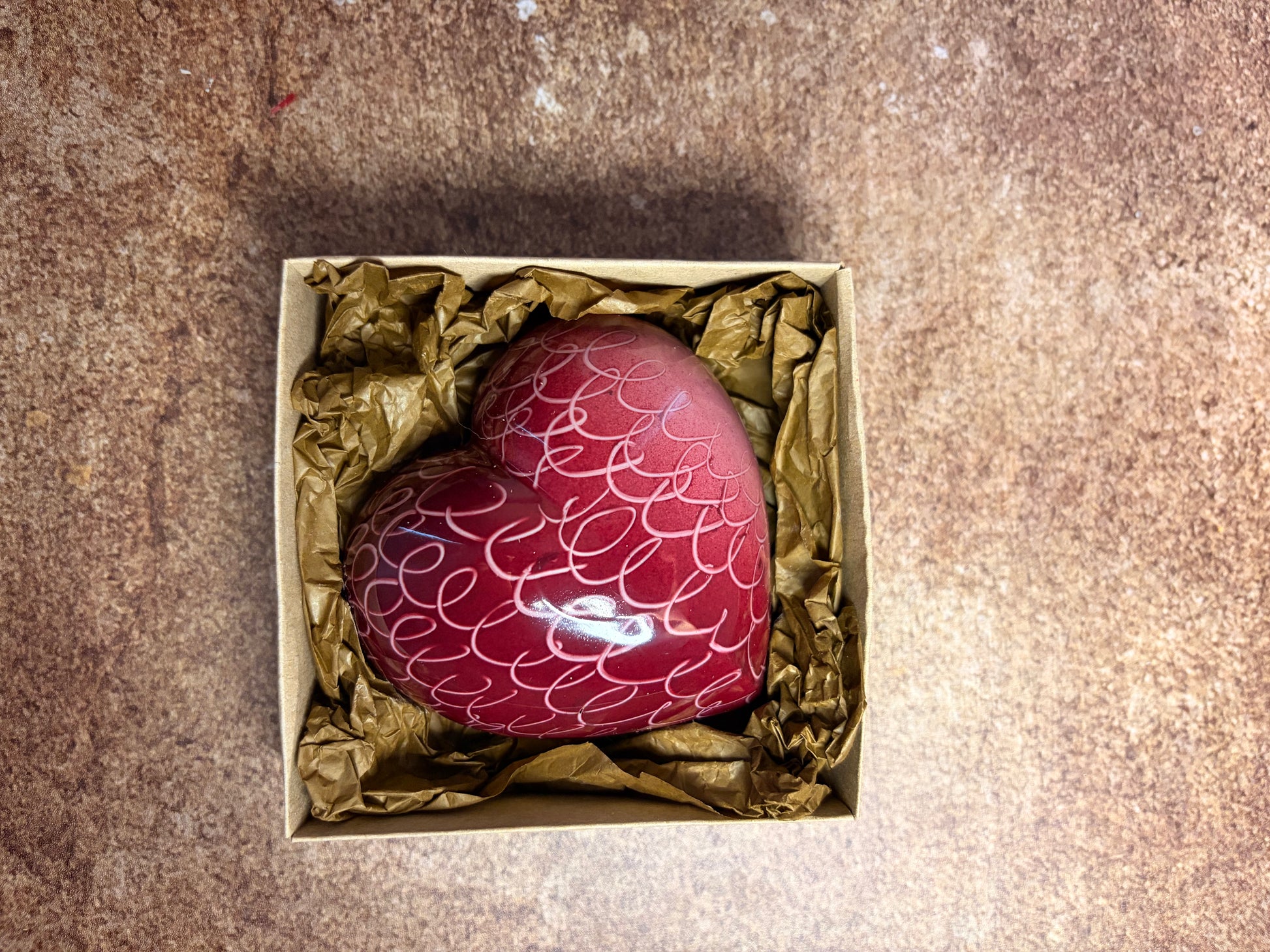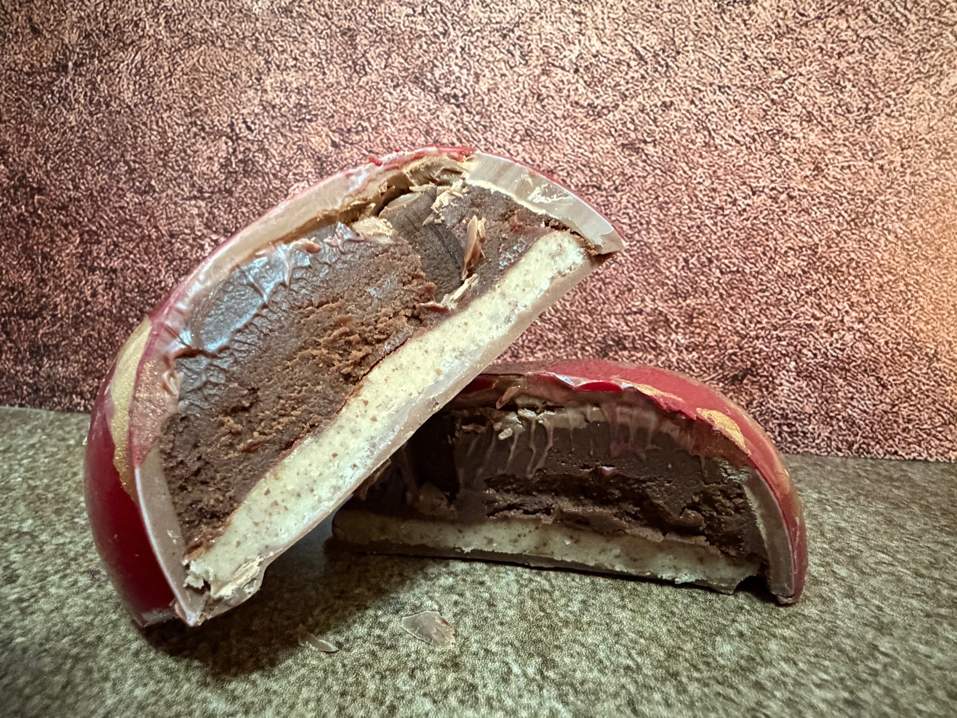 Изискано шоколадово сърце, създадено от фин млечен шоколад, което крие в себе си богат и балансиран пълнеж. Вътрешността съчетава плътен черен шоколад със сушени череши и ликьор от диви череши, допълнен от нежен пласт бадемов крем с бял шоколад. Хармония от вкусове, създадена за специални моменти и подарък от сърце.